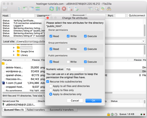 - Once the FileZilla is done changing folder permissions, repeat step 3 again. But remember, you have to choose to apply to files only option this time. Then enter the numeric value 644 in the provided field.