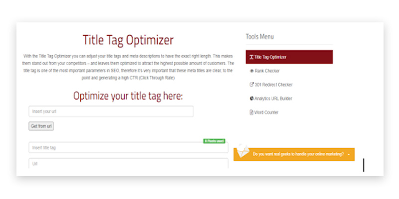 Title tags are important, as they give search engines & readers an idea of what further page, blog post, or website is all about. The tool helps in optimizing your meta titles, title tags, meta descriptions in terms of factors like keyword density, value to reader, length, and more.