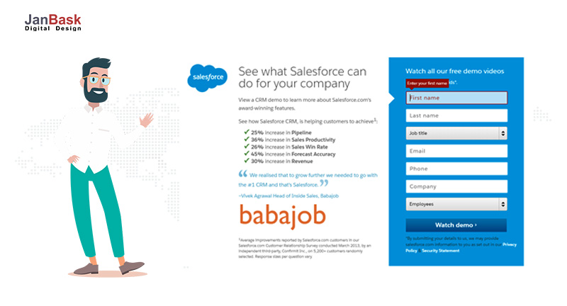 Salesforce has definitely set a very good example for this. Their call to action button and the sign-up page are to the point no extra things required which in turn makes the user very happy by not typing or going through hassles.